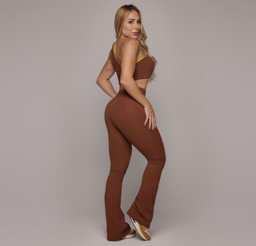 CALÇA FLARE CANELADO DOCE DE LEITE + TOP