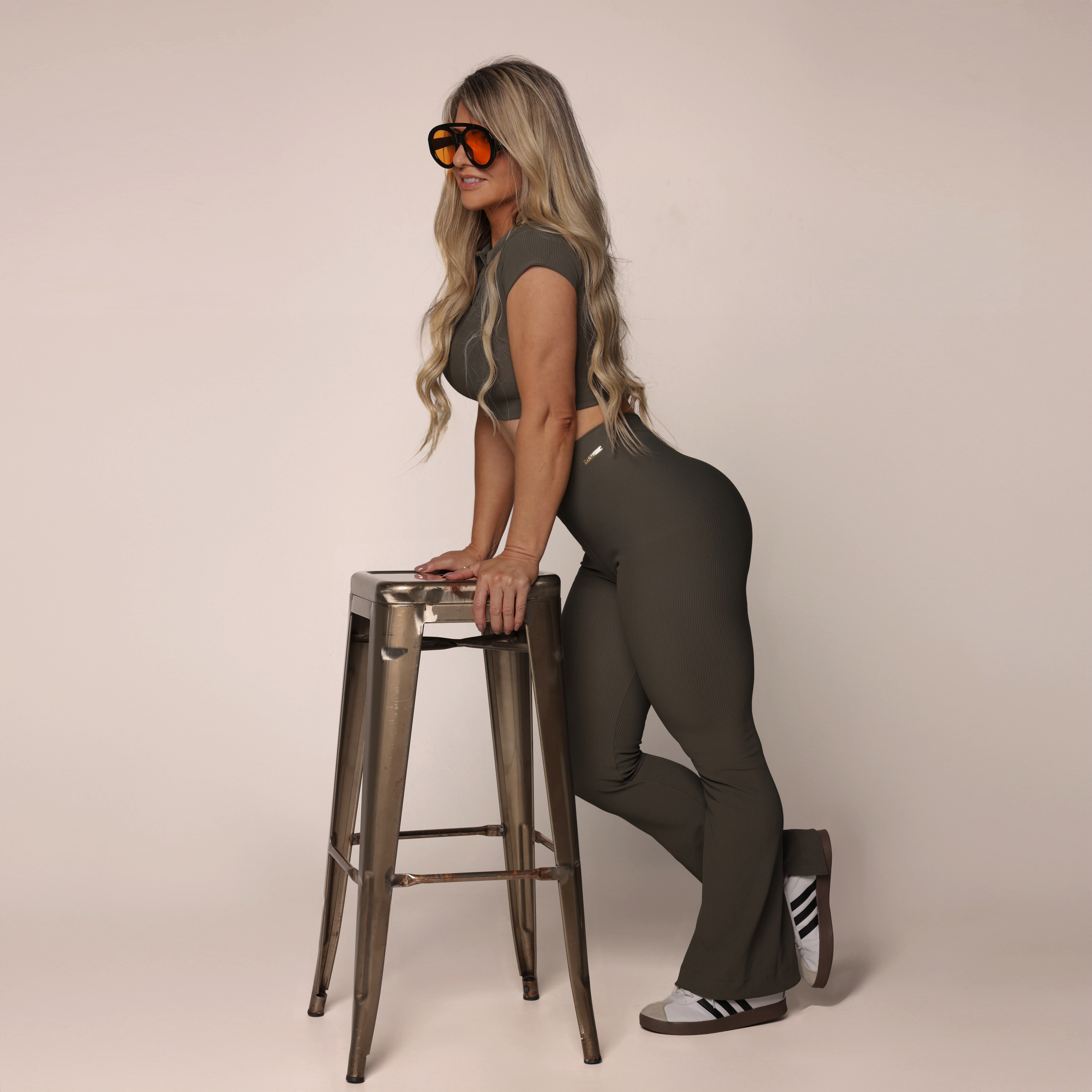CALÇA FLARE CANELADO DOCE DE LEITE + TOP