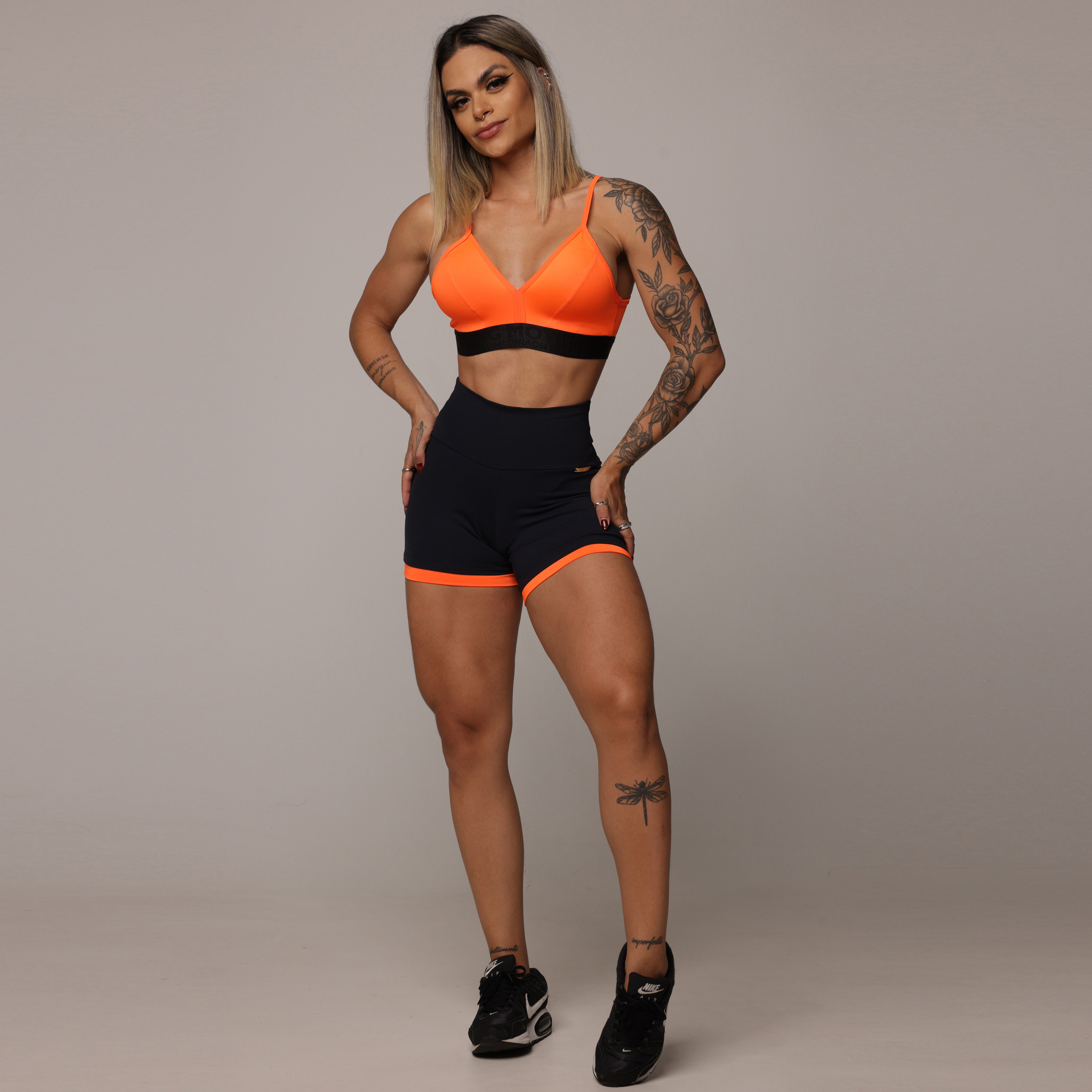 CONJUNTO TOP + SHORT GYM COMUM PRETO COM LARANJA NEON