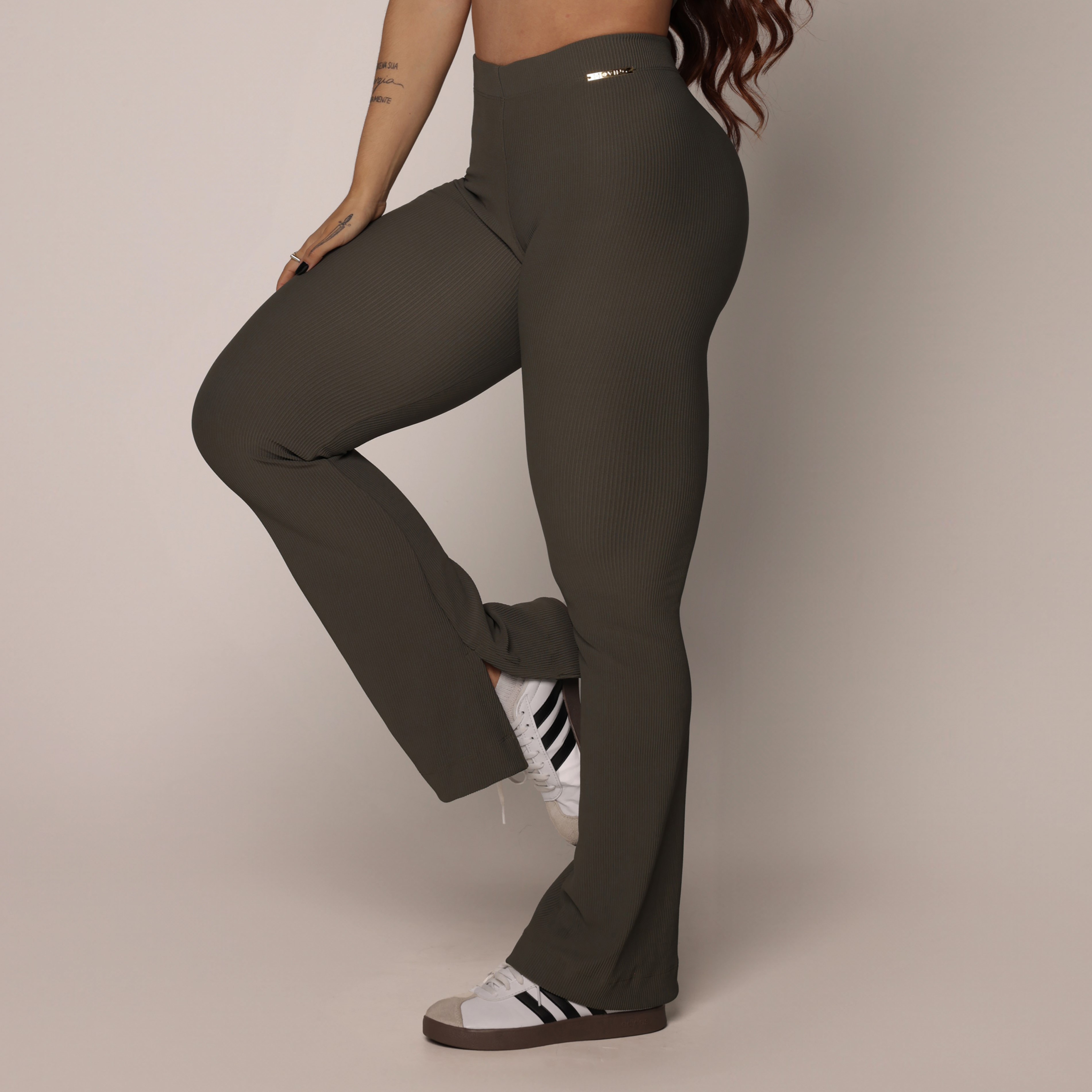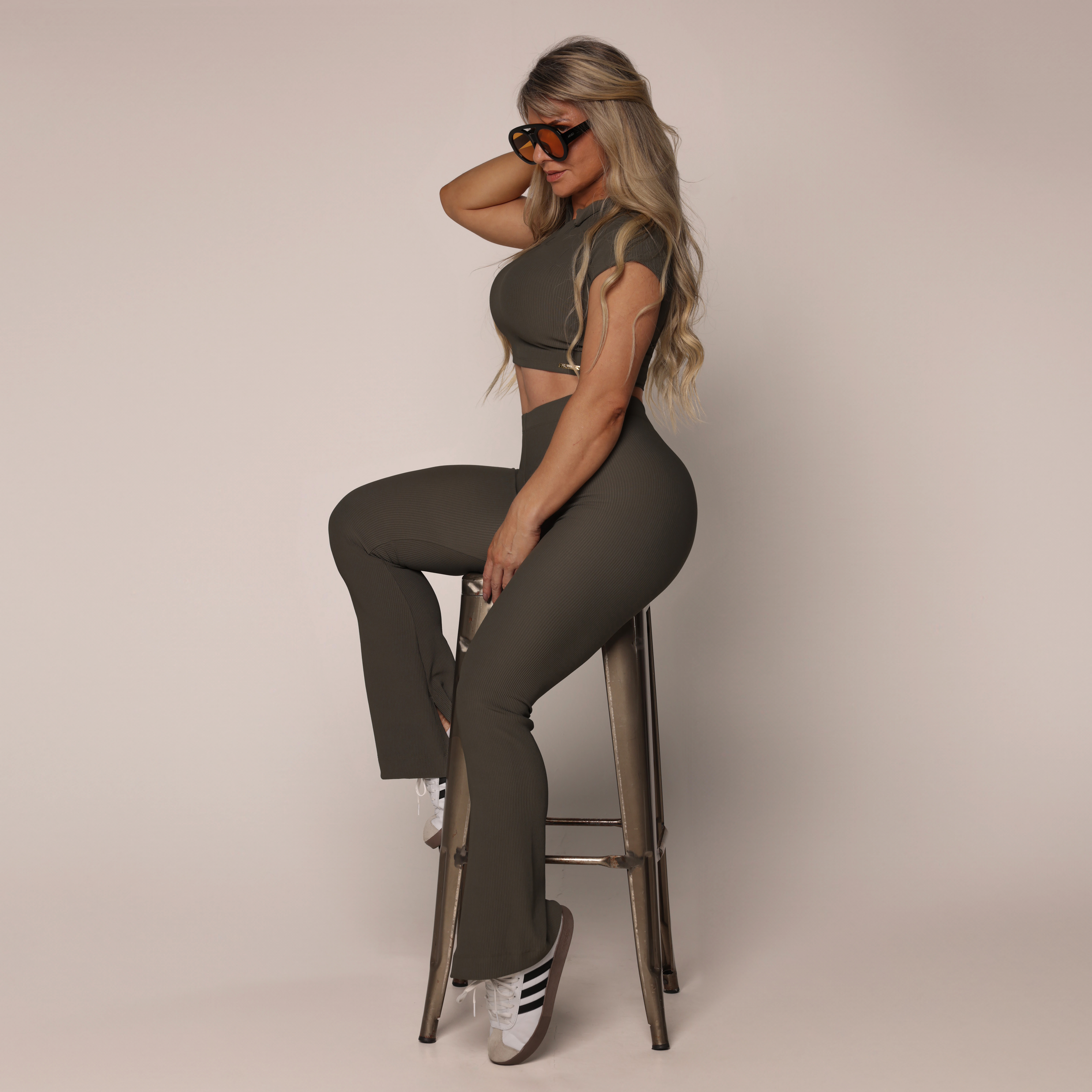 CONJUNTO TOP + CALÇA FLARE JACQUARD CANELADO VERDE MILITAR