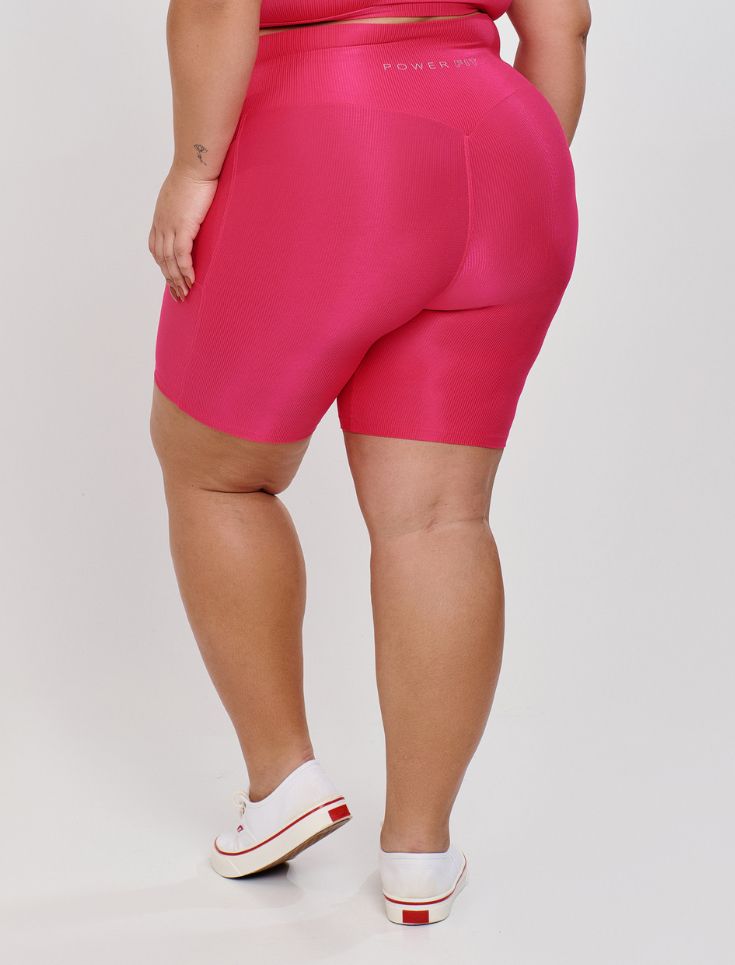 Bermuda Canelada Plus Size com Bolso, na cor rosa pink, é confeccionada em tecido microcanelado de poliamida com efeito glossy acetinado, que oferece um brilho sofisticado e moderno. Com compressão média, ela é a escolha ideal para treinos de alto impacto como crossfit, funcional e corrida, proporcionando conforto e segurança em cada movimento.