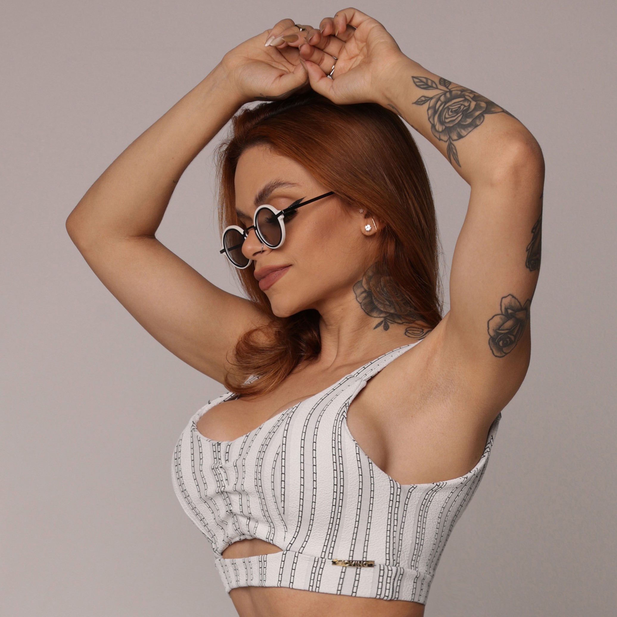 O detalhe vazado no meio dos seios, do Top Georgia, destaca o colo e proporciona a sustentação que você precisa, trazendo charme a cada movimento. Eleve seu look com este top que combina sutileza e suporte.